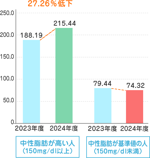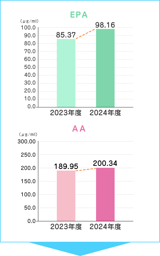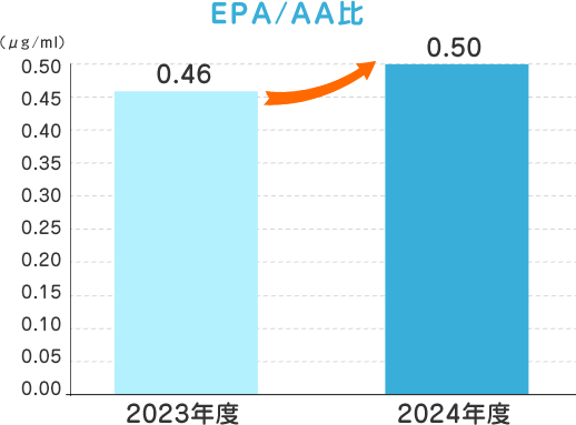 2023年度と2024年度でEPAおよびAAの量を比較したところ、EPA・AAとも数値が上がるとともにEPA/AA比も改善していました。これは、AA量の増加をもたらす食生活の変化があったものの、サプリを摂取したことでAAの上昇以上にEPA量が増加してこれを補い、結果的に改善に繋がったといえます。